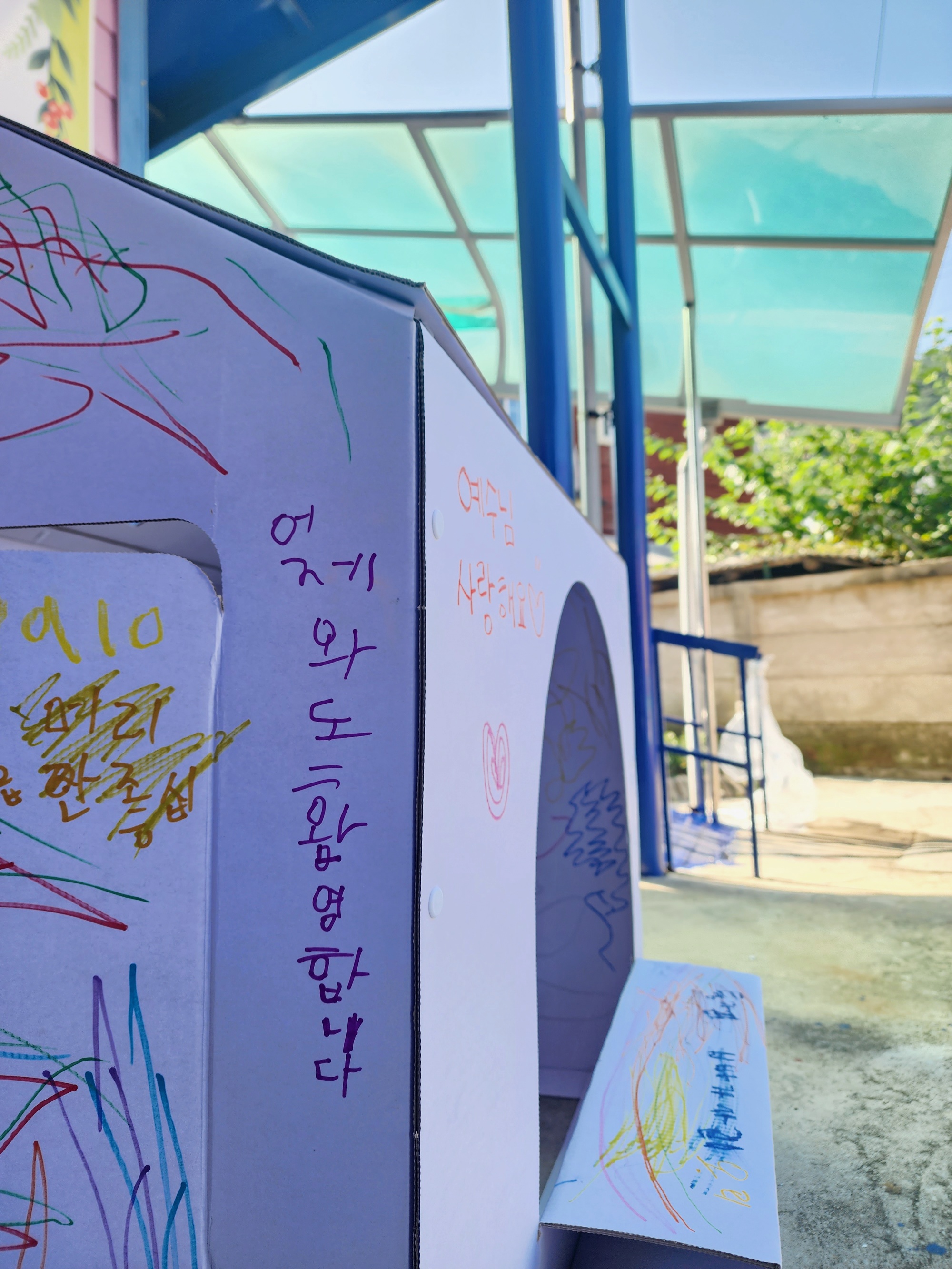 "언제 와도 환영합니다"라고 적은 어린아이의 글씨가